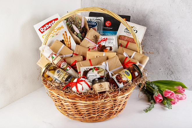 Перед вами премиальная корзина, где собрано всё лучшее: 12 видов сыров, большое дополнение в виде конфитюра, сырные конфеты, средиземноморские закуски и отборные мясные деликатесы.