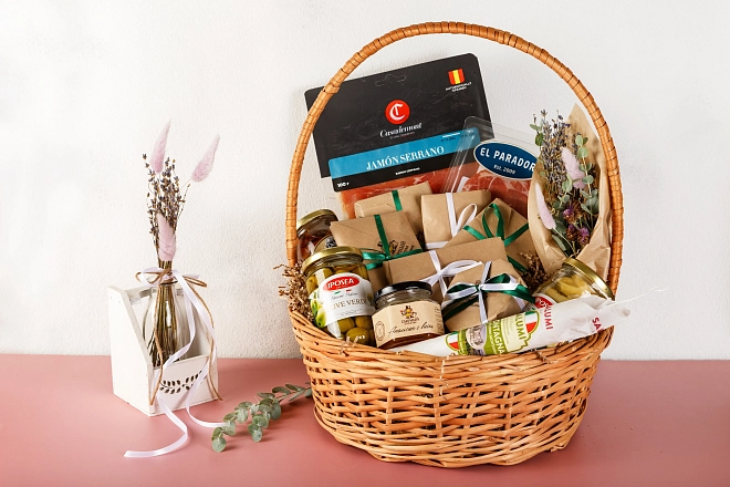 Набор приедет в изящной плетёной корзине, аккуратно упакованной в прозрачную плёнку.